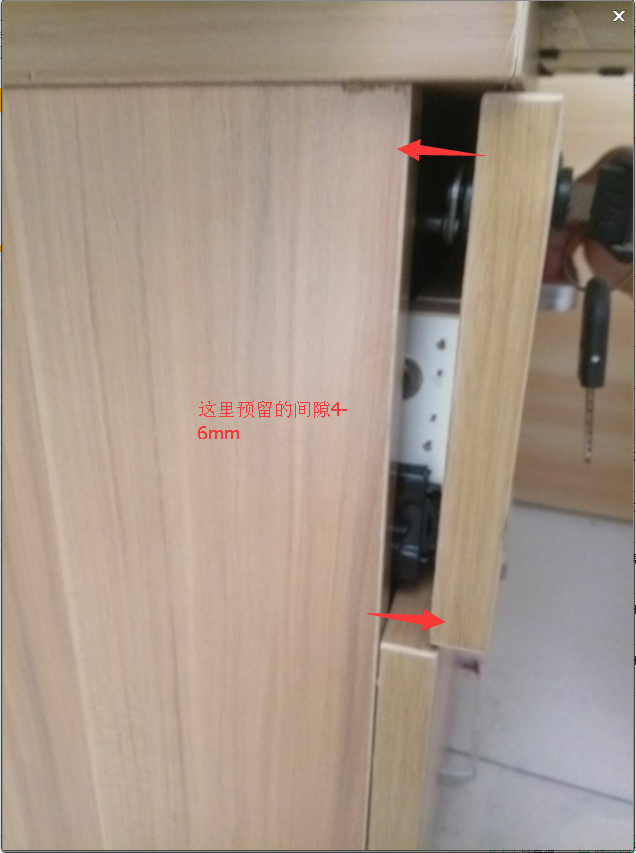 2.安裝反彈滑軌的時候我們應該預留4-6個毫米的安裝間隙,這樣就可以讓反彈滑軌有更完美的反彈距離,(當然在安裝滑軌的過程中左右2只滑軌上下之間的間隙和左右之間的距離都應該要一致哦,這可是最基本的要求)。因為我們的反彈滑軌是一按即開的,如果您預留的間隙在4個毫米以下,您的抽屜彈出來的效果就非常的不好了,預留間隙的位置如下圖所示: