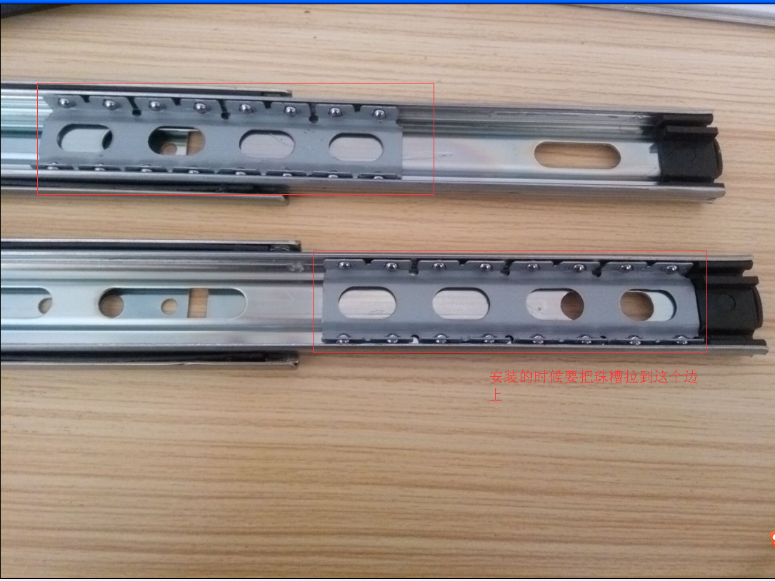滑軌固定在柜體和抽屜側(cè)板上的時(shí)候,員工就會(huì)拿起抽屜對(duì)準(zhǔn)滑軌推進(jìn)去就完全了抽屜安裝,但是當(dāng)滑軌中軌的珠糟不在邊上的時(shí)候,我們發(fā)現(xiàn),有時(shí)候安裝抽屜推進(jìn)去的時(shí)候內(nèi)軌和珠糟不能重合在一起,造成推拉不順暢,員工會(huì)用力推拉進(jìn)去使抽屜安裝,這樣不小心用力推拉會(huì)把珠糟上面的擋點(diǎn)沖壞掉,抽屜再拉出來的時(shí)候,珠糟不會(huì)跟著內(nèi)軌一起滑動(dòng),就會(huì)造成抽屜一拉就掉出來了。我們?cè)诎惭b抽屜滑軌的時(shí)候,應(yīng)該把珠糟往我們這邊的方向拉到位再安裝,這樣內(nèi)軌和珠糟可以重合在一起推拉,抽屜裝好推拉順暢,不會(huì)出現(xiàn)以上所說的情況。