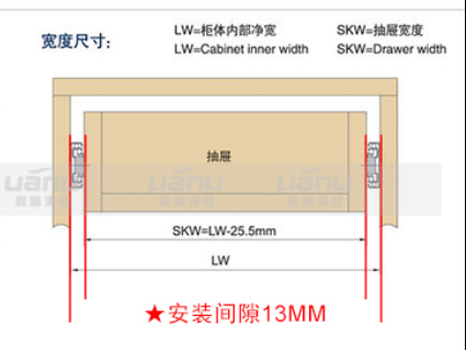 若安裝間隙小于13mm,比如抽屜面板和柜體側(cè)板之間預(yù)留間隙在12.5mm的話,滑軌安裝好會(huì)出現(xiàn)推拉很緊的情況,因?yàn)榛壍暮穸仁?2.7mm,等于滑軌在中間被擠壓著推拉,就會(huì)出現(xiàn)推拉很緊的情況。