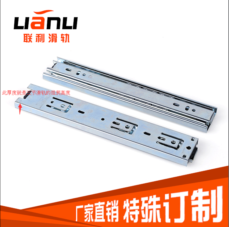 時(shí)間: 2015-11-27 14:26:24 來源: 東莞市聯(lián)利滑軌制造有限公司把三節(jié)滑軌看成是一個(gè)長方體,用長方體的長寬高來對(duì)應(yīng)滑軌的參數(shù),長方體的長就是滑軌的長度,一般用寸來表示(25mm為1寸),而三節(jié)滑軌滑軌的組裝高度就是指滑軌的厚度,抽屜的安裝間隙是以三節(jié)滑軌的厚度來預(yù)留,一般三節(jié)滑軌的組裝高度為12.7mm,而材料偏薄的三節(jié)滑軌的組裝高度為10/11mm等,重型三節(jié)滑軌的組裝高16mm、19mm、20mm等的。
