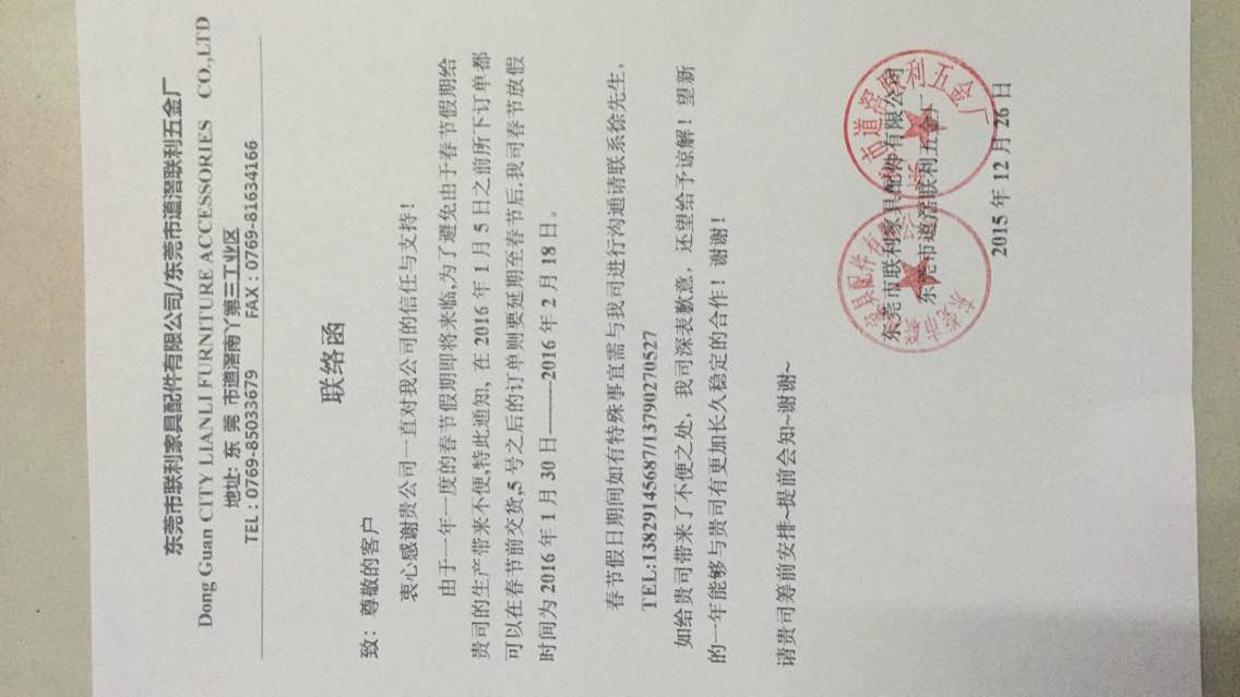 首先感謝大家在過去一年給予我公司的鼎力支持。在2015年春節(jié)即將來臨之際,聯(lián)利滑軌全體員工恭祝大家新春愉快,合家歡樂,萬事如意,猴年吉祥!!!以下是我司放假通知安排: